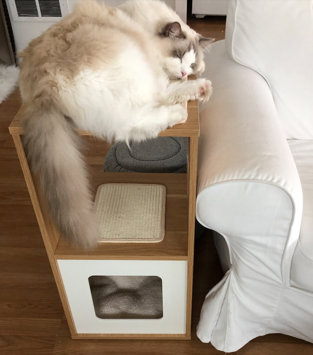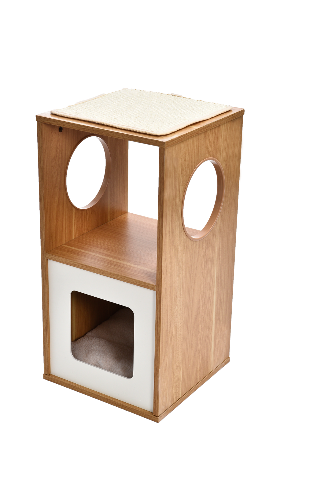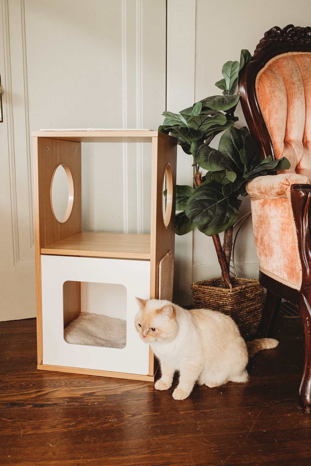 This sleek & stylish two-tier shelf has a cave on the bottom and an open loft top with windows on top for all the cool cat vibes your home needs. Give your cat a cozy nook that isn’t also an eye sore.